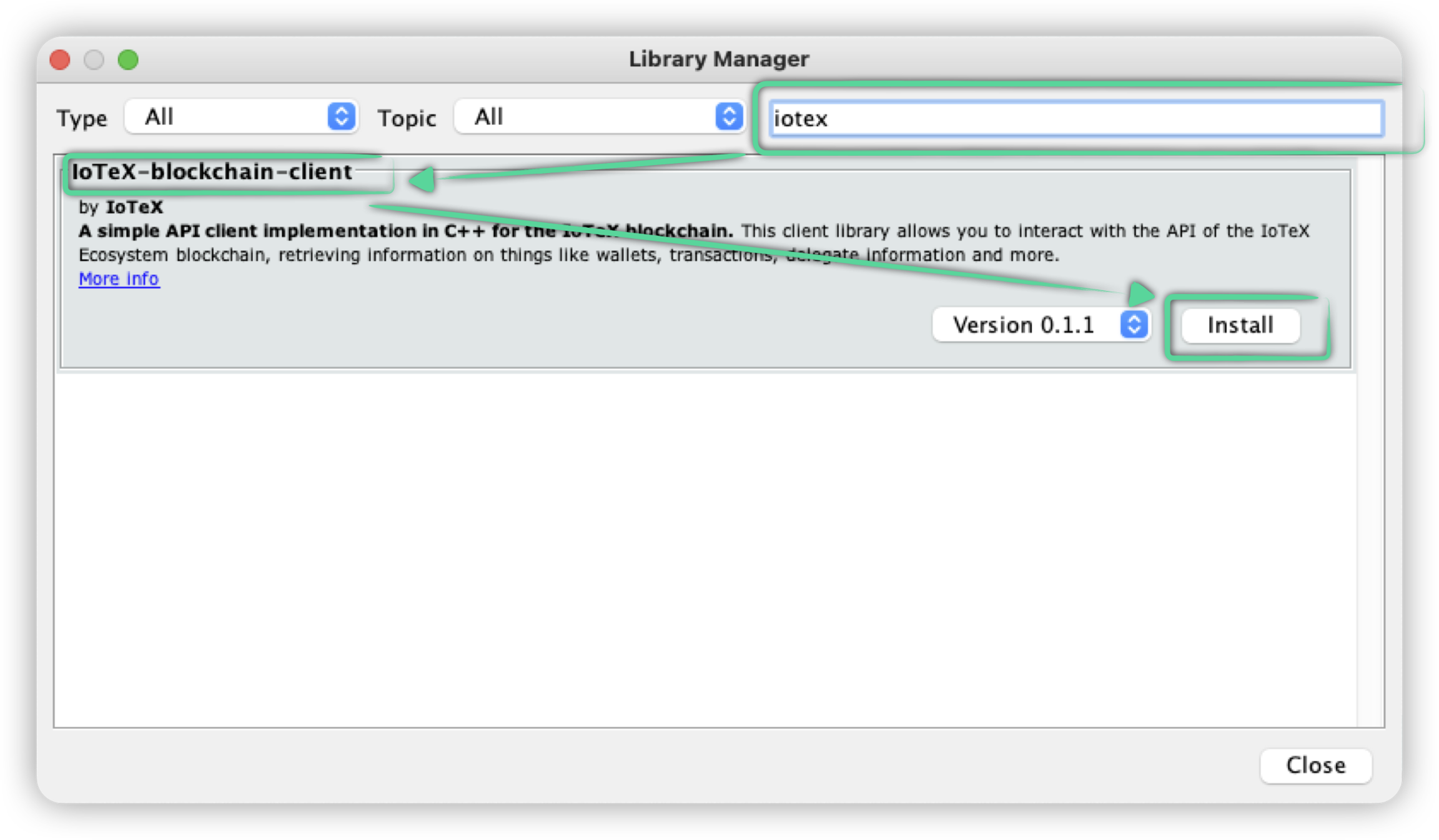 In the Library Manager dialog, search for IoTeX-blockchain-client and click install