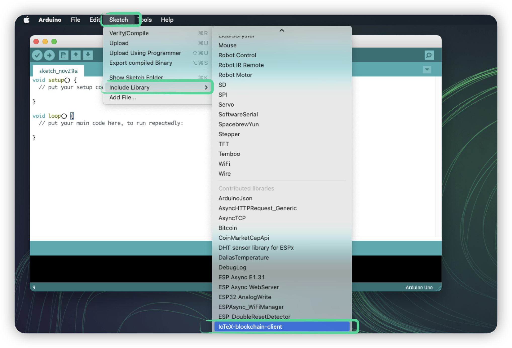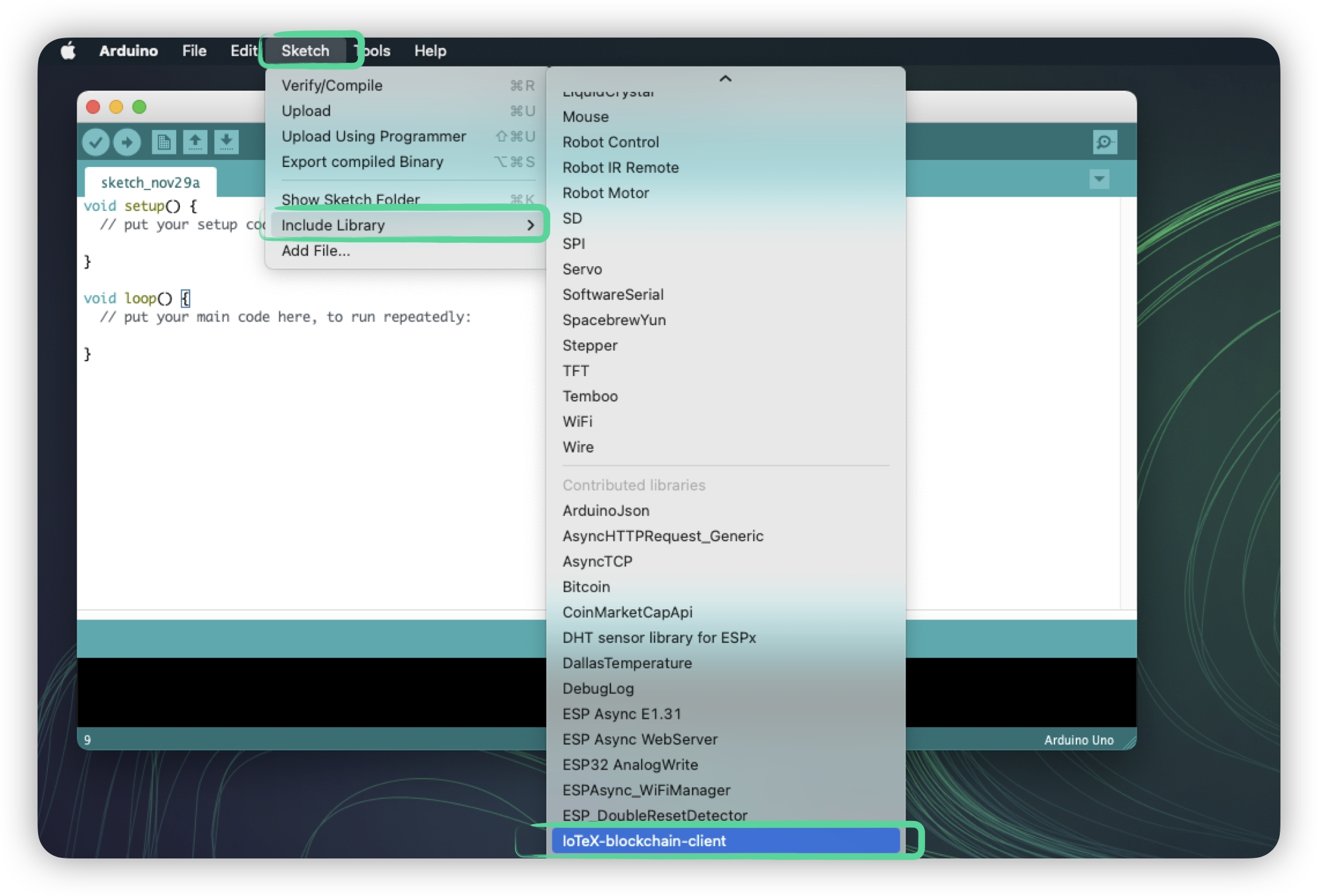 Go to Sketch->Include library and select IoTeX-blockchain-client.