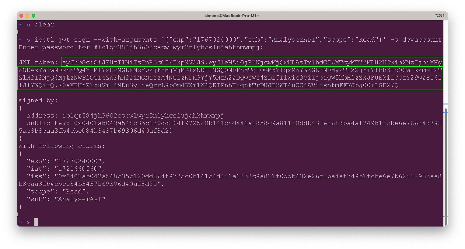 ➜ ioctl jwt sign --with-arguments '{"exp":"1608193125","sub":"weather","scope":"Create"}' -s my_account -y