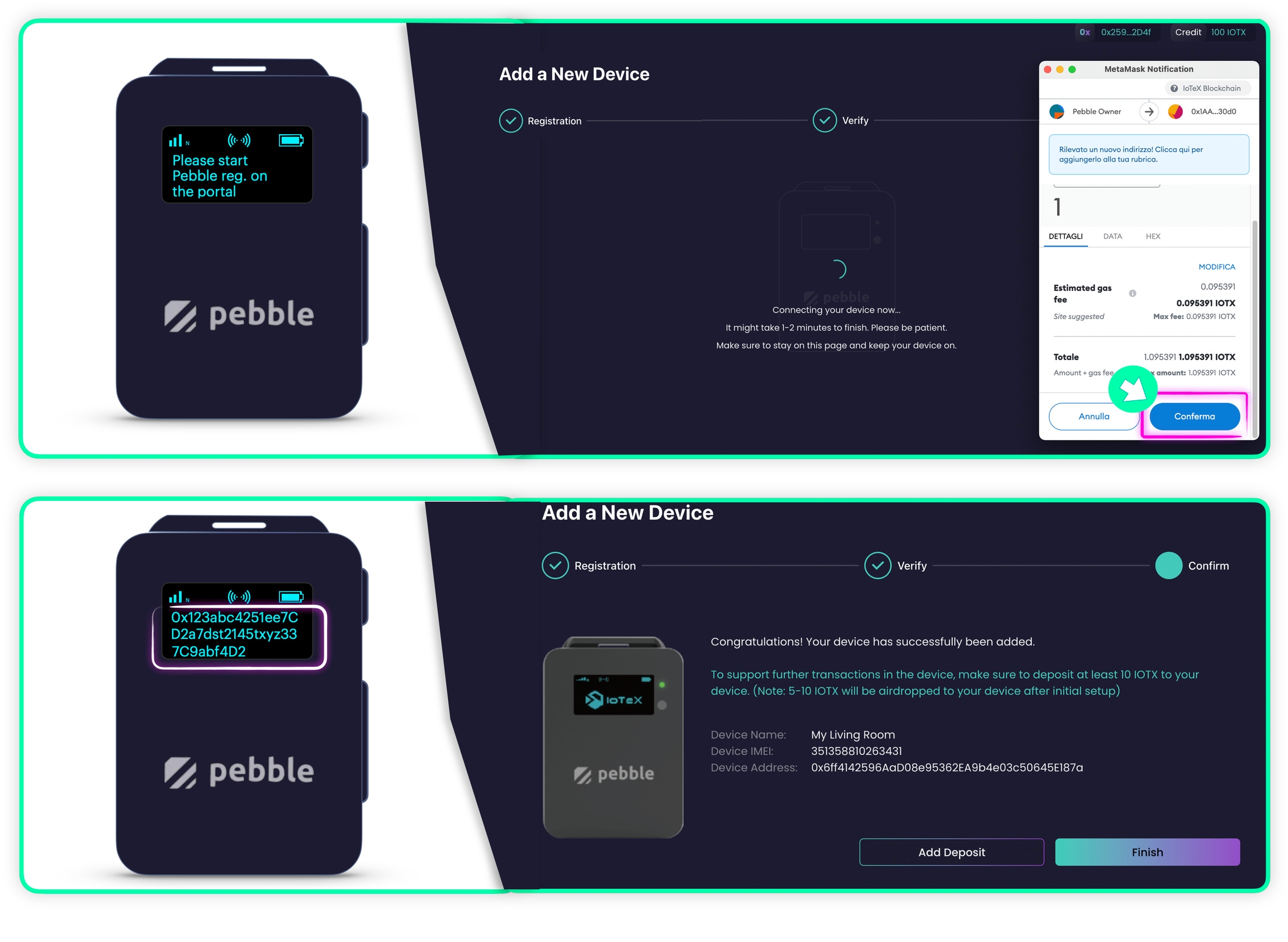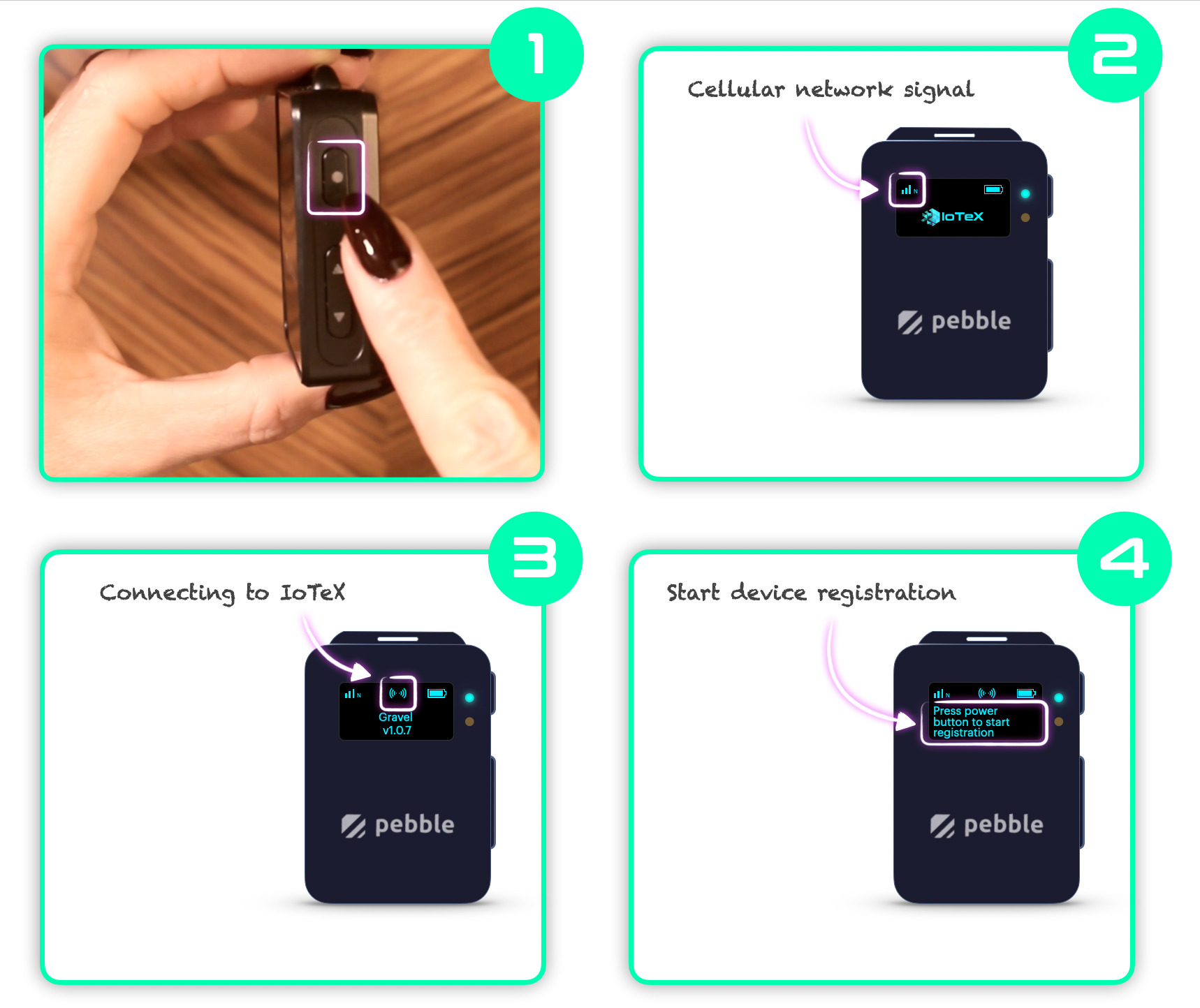 Wait for the Pebble Tracker to establish a cellular connection and begin communicating with the network. You will then be prompted to initiate the registration process, which will link the device to your IoTeX wallet as its owner.