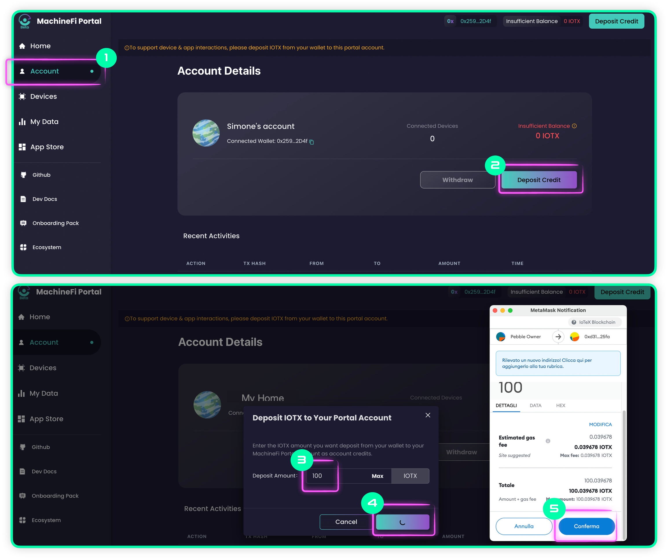 Once a MachineFi account is created, you should deposit some IOTX credit. This step is not strictly required at this moment: if you want, you can skip it and go ahead with registering your Pebble. You can deposit credit at any moment.