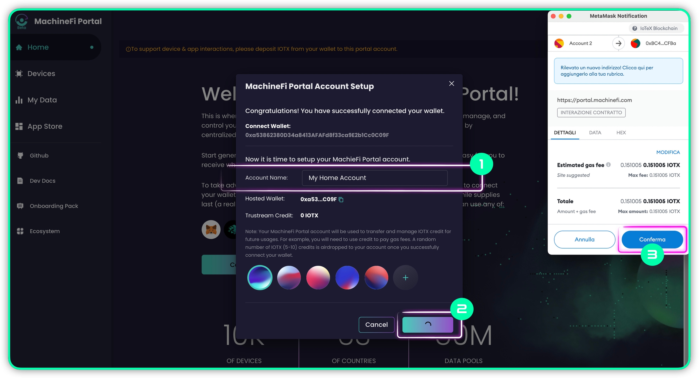 Open the MachineFi device portal at portal.machinefi.com, and connect a blockchain wallet account that you want to use as your Devices Owner Account, the portal will automatically start the account registration process: