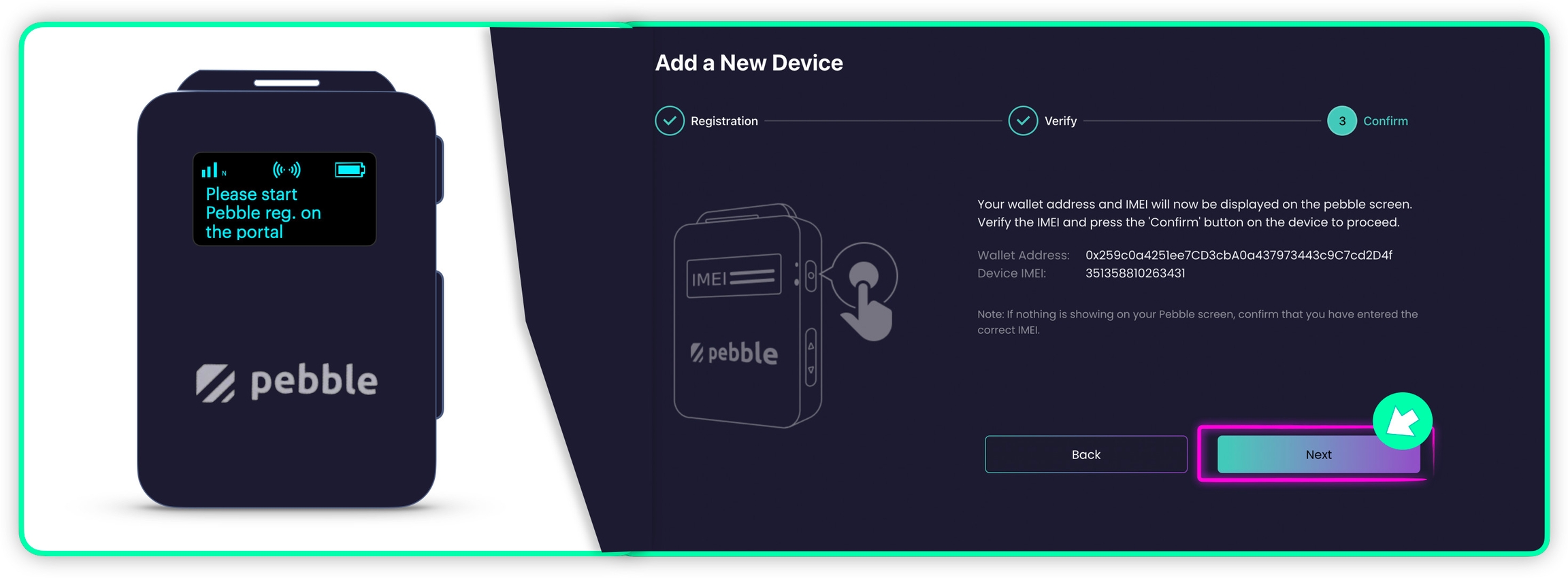 Follow the registration screens until you reach the "Confirm" step, where the owner address and device IMEI number are shown: