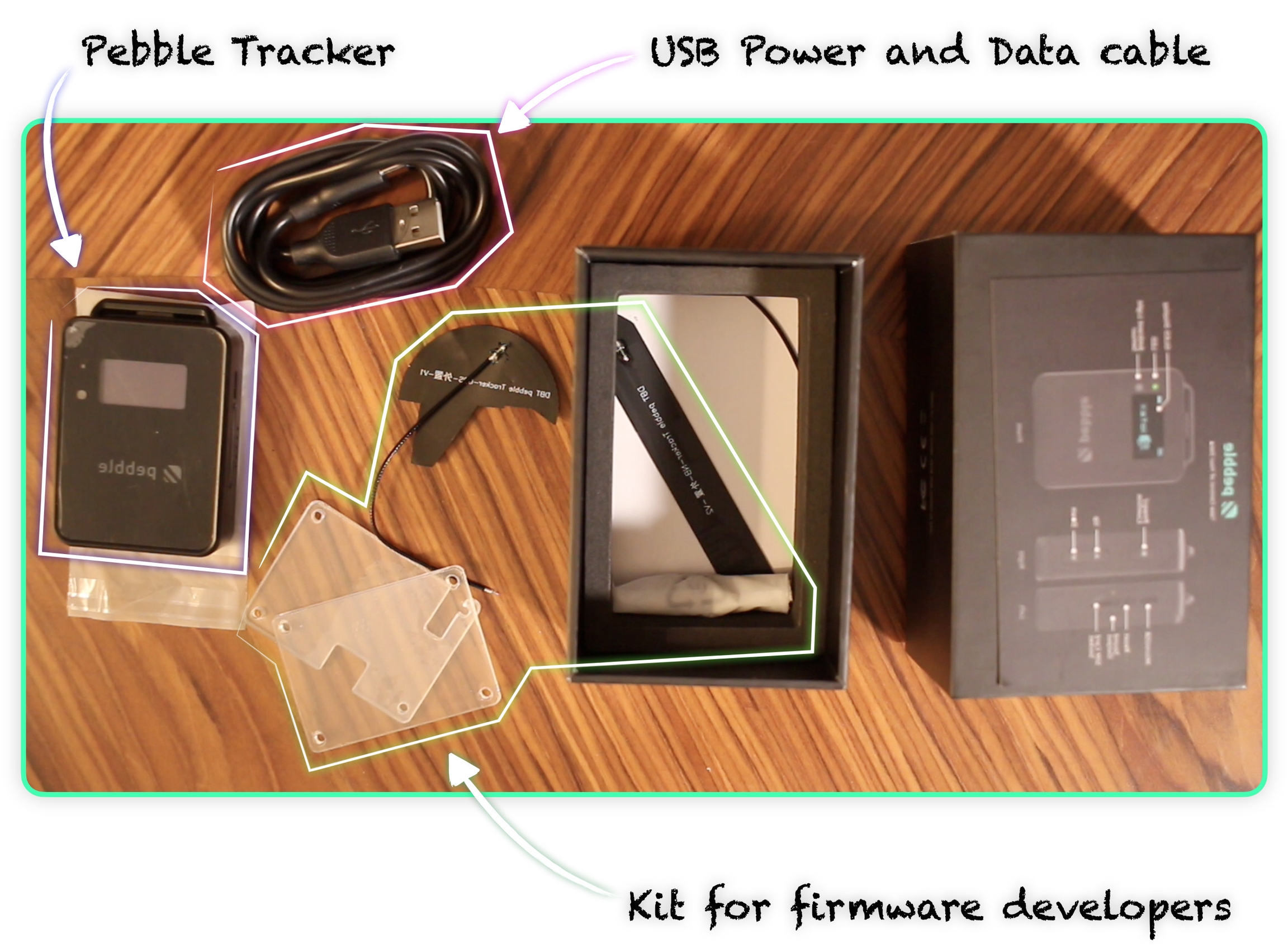 Before turning on your Pebble Tracker, let's take a look at what's in the box: