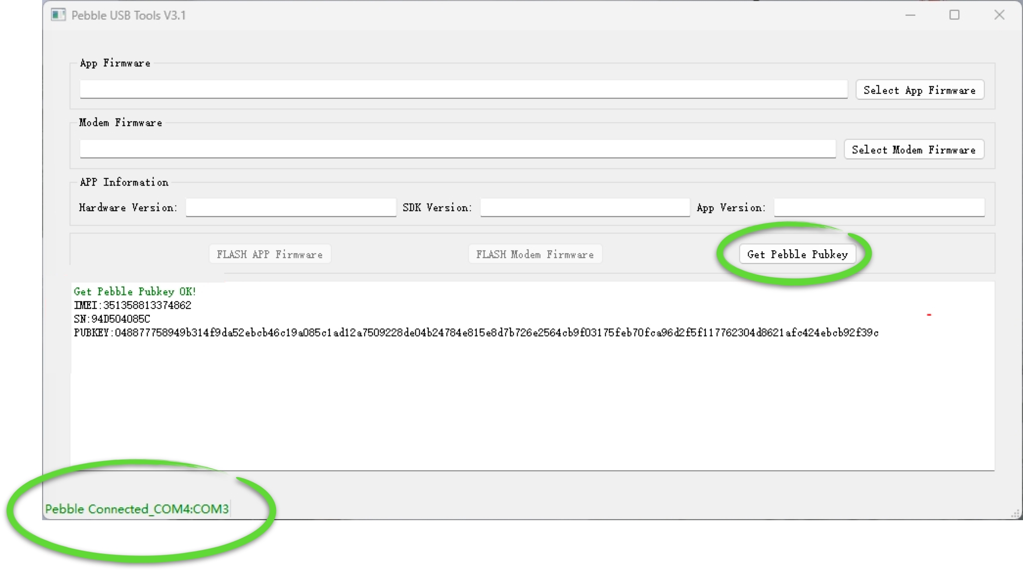 Opening the Info Menu on your Pebble Tracker will give you access to the IMEI and Serial Number, as well as allow you to obtain the device’s public key using the Pebble Desktop tool, if needed.