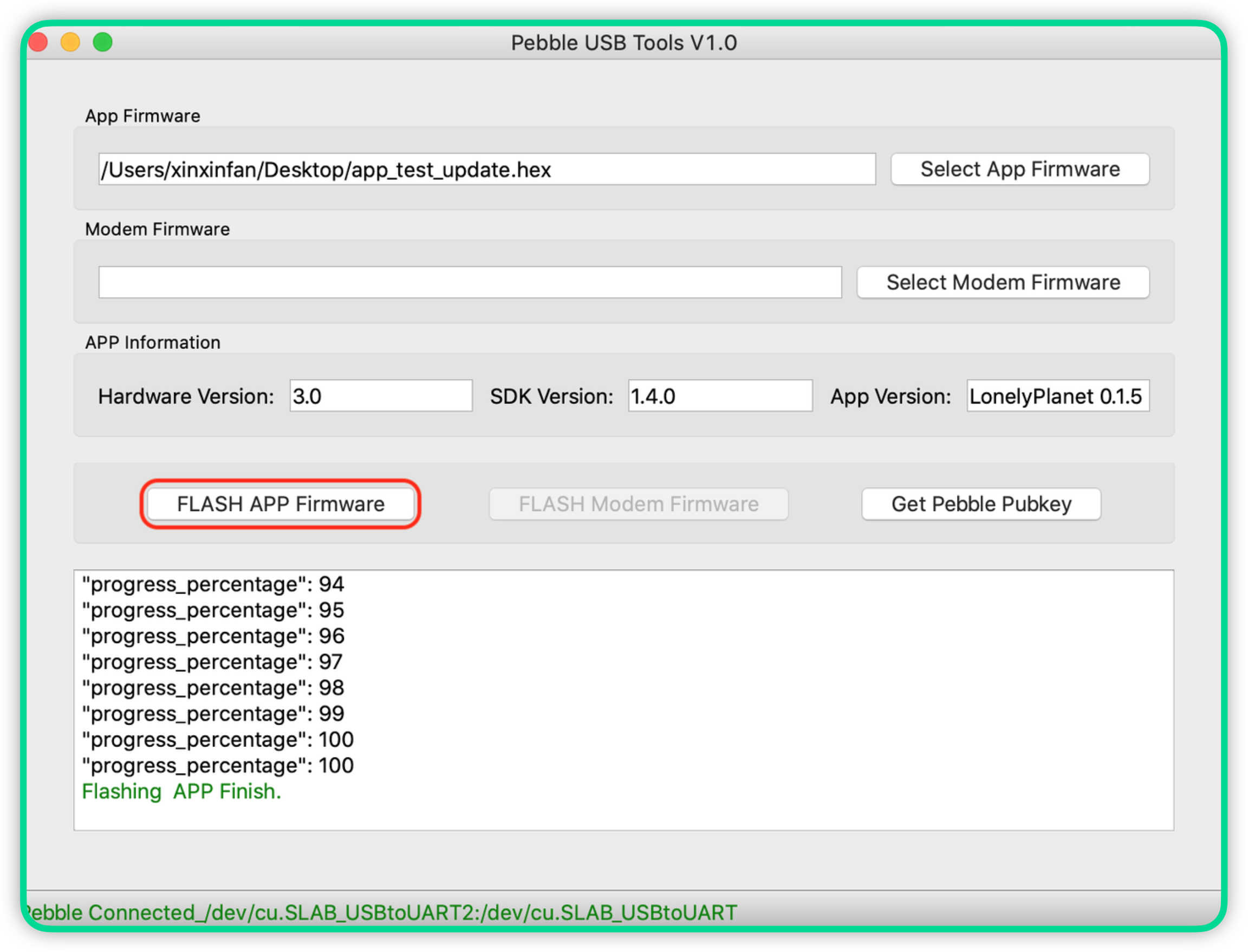 Flash APP Firmware” button and follow the flashing progress in the log area: