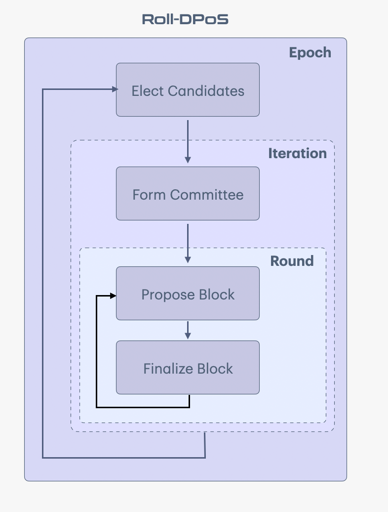 To have a fast and efficient consensus mechanism with instant block finality in the context of DePIN, the IoTeX blockchain combines the concepts of Delegated Proof of Stake (DPoS), Proctical Bizantine Fault Tolerance (PBFT) and Verifiable Random Functions (VRFs). VRF is a family of functions that can produce publicly verifiable proofs for the correctness of their random outputs. At a high level, our Roll-DPOS has four phases elect candidates, form committee, propose block and finalize block.