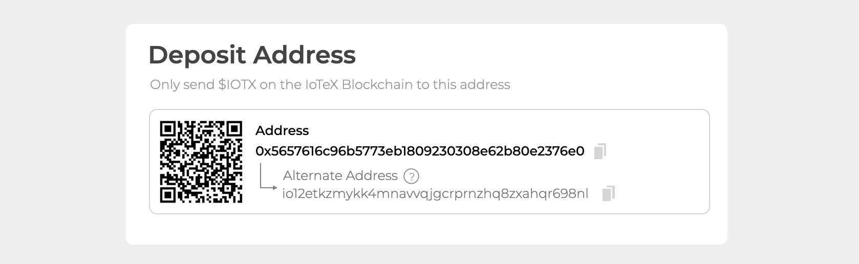 <figure><img src="https://content.gitbook.com/content/EyawgxYexImpo6OGzEiR/blobs/FF3yK4W6UYVQiWG6cs2A/image.png" alt=""><figcaption><p>Example UI for $IOTX deposit flow on the IoTeX Blockchain</p></figcaption></figure>