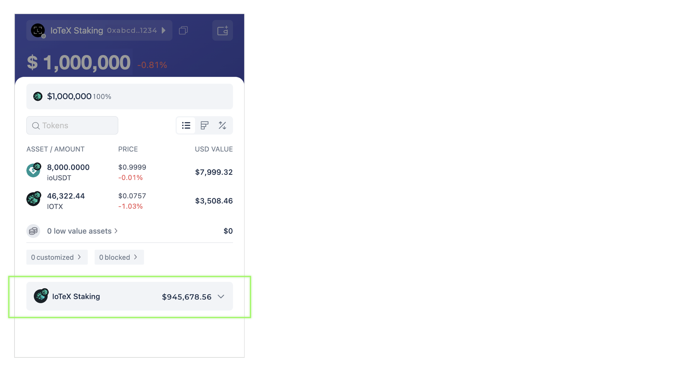Rabby Wallet offers a seamless and straightforward UI to engage with your assets, thanks to its native integration of the IoTeX Blockchain. This means that users do not need to undergo any additional configuration steps to manage their IOTX tokens, track their staked IOTX balance, participate in staking, or interact with IoTeX's decentralized applications (DApps).&#x20;