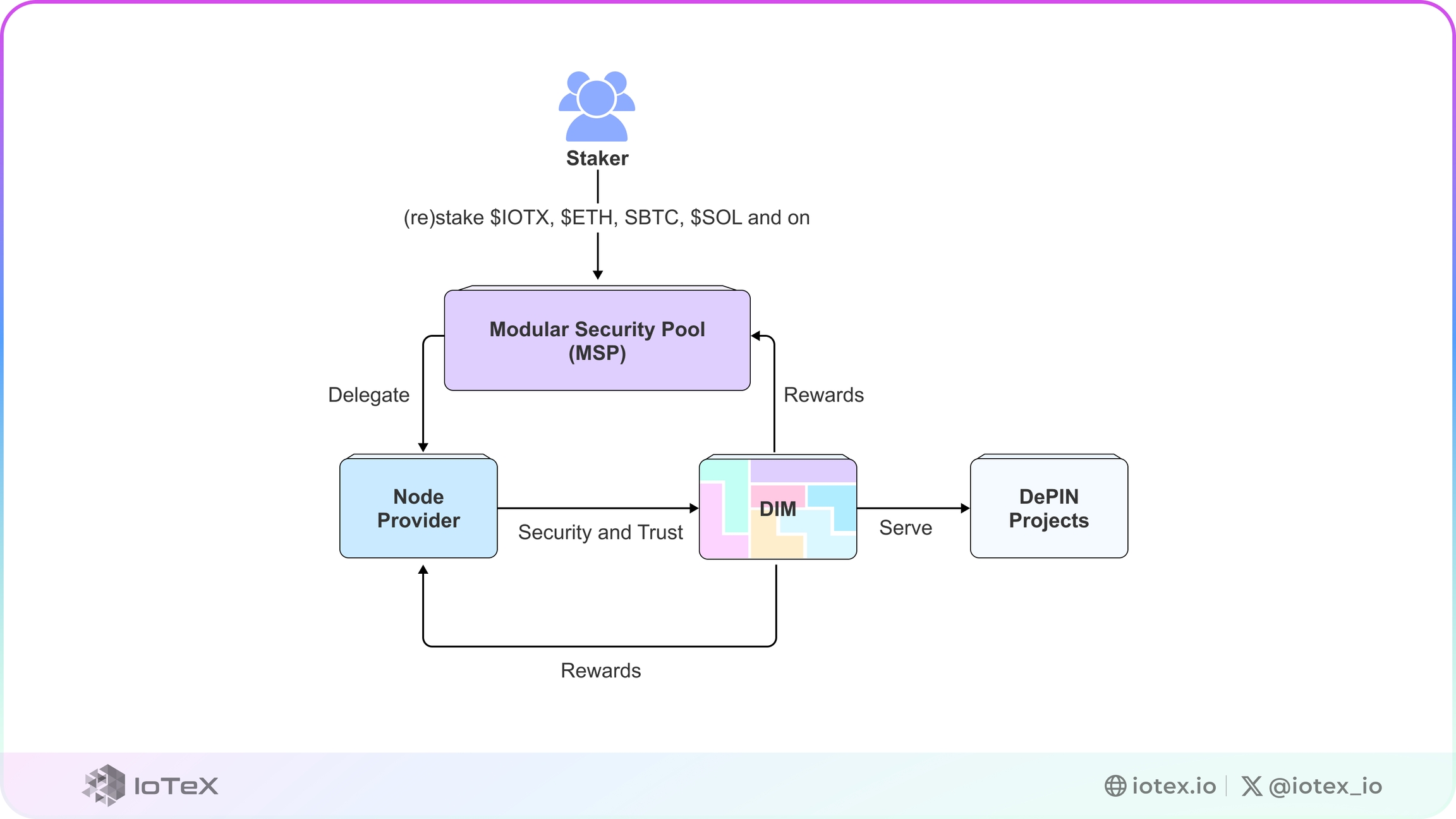Stakers Delegate Assets: Participants in Layer 1 blockchains like IoTeX or Ethereum delegate their assets to the MSP, enhancing the security of MSP-powered networks.
