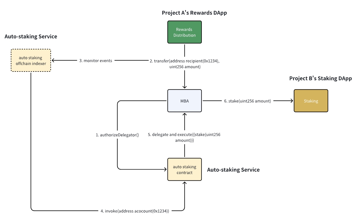 The figure below demonstrates a typical workflow of how on‐chain rewards from a third‐party “Rewards Dapp” can be automatically re‑staked into a separate “Staking Dapp” via an off‑chain “Auto‑staking Service” and an MBA wallet module.