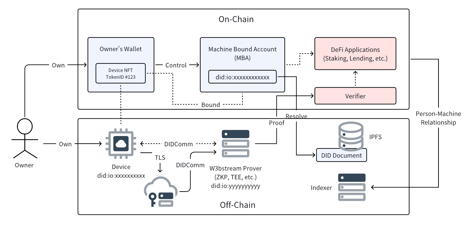 Machine-Bound Account (MBA) A smart contract wallet inspired by ERC-6551, created for each device NFT. The MBA enables the machine to interact directly with decentralized applications (dApps), manage assets, and execute transactions autonomously.