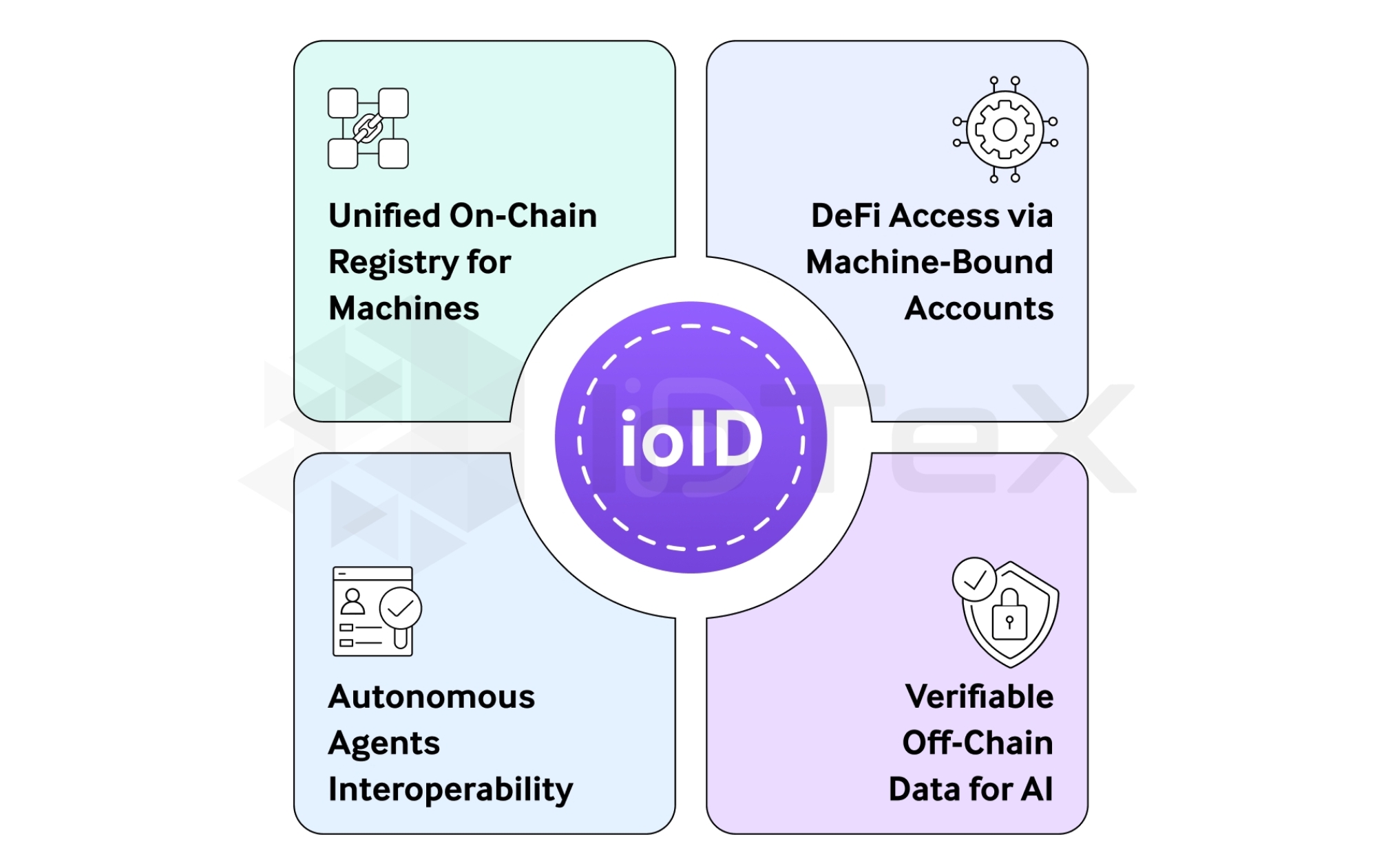 A “Google for Machines”: ioID enables a universal registry of machines, smart agents, and physical AI. Each entity is assigned a globally unique, metadata-rich identity that bridges on-chain and off-chain ecosystems. This makes it possible to: